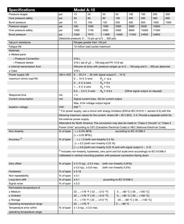 Specificità Opzionalmente il modello A-10 è disponibile con una non linearità migliorata, a seconda della non linearità selezionata si ottengono i seguenti valori:5 per cento di span Non linearità ≤ ±0.25 % di span Non linearità per BFSL per IEC 61298-2 Intervallo di misura ≤ 0,1 bar [≤ 1,45 psi] ≤ ±0,5 % di span - Intervallo di misura > 0,1 bar [> 1,45 psi] ≤ ±0,5 % di span ≤ ±0.25 % della lunghezza 1) Precisione → V.. errore di misura per IEC 61298-2 Max. errore di misura per IEC 61298-2 Intervallo di misura ≥ 0,6 bar [≥ 8,7 psi] ≤ ±1 % di span ≤ ±0,5 % di span Intervallo di misura ≥ 0,4 bar [≥ 5,8 psi] ≤ ±1,2% di span ≤ ±0.7 % di span Intervallo di misura ≥ 0,25 bar [≥ 3,6 psi] ≤ ±1,3 % di span ≤ ±0,8 % di span Intervallo di misura ≥ 0,16 bar [≥ 2,3 psi] ≤ ±1,5 % di span ≤ ±1 % di span Intervallo di misura ≥ 0,1 bar [≥ 1,45 psi] ≤ ±1.8 % di span - Intervallo di misura ≥ 0,05 bar [≥ 0,73 psi] ≤ ±2,4 % di span - Errore di punto zero 2) 3) 4... 20 mA / DC 1... 5 V / DC 0,5... 4,5 V / DC 0,5... 4,5 V razionometrici ≤ ±0,3 % di span ≤ ±0.2 per cento della portata DC 0 ... 10 V ≤ ±0,5 % di span ≤ ±0,4 % di span DC 0... 5 V 4) ≤ ±0,6 % di span - 1) Non possibile con segnale di uscita DC 0... 5 V. 2) Intervalli di misura ≤ 0,1 bar [≤ 1.45 psi] (o equivalente) solo possibile con ≤ ±0.5 % di span. 3) Al di fuori delle condizioni di riferimento, aggiungere l'isteresi di temperatura per intervalli di misura < 0,6 bar [< 8,7 psi]. 4) Non possibile con intervalli di misura ≤ 0,1 bar [≤ 1,45 psi] (o equivalente).In caso di guasti occasionali dovuti a scariche elettrostatiche, può verificarsi un ulteriore errore di misurazione temporaneo fino a ±2,5%.![]()