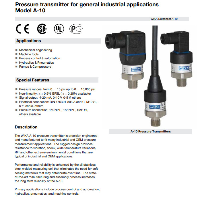 : trasmettitore di pressione di alta qualità per applicazioni industriali generali; modello S-20; cfr. scheda PE 81.61 Sensore di pressione con IO-Link; modello A-1200; cfr. scheda PE 81.90 scheda PE 81.60 ∙ 05/2023 Pressure transmitter For general industrial applications Model A-10 Description The field-proven model A-10 pressure transmitter (pressure sensor) is the all-rounder for pressure measurement in industrial environments. Compatto, può essere integrato in una vasta gamma di macchine.Qualità eccellente e tecnologia collaudata La nostra esperienza pluriennale e la conoscenza precisa delle esigenze dei clienti sono state incorporate nello sviluppo del modello A-10Si è dimostrata in innumerevoli applicazioni da oltre dieci anni.La qualità costantemente elevata e la sua funzione affidabile sono apprezzate in tutto il mondo e confermate regolarmente da audit interni ed esterniQuesto bestseller può tollerare fino a 100 milioni di cicli di carico con una precisione quasi costante.■ costruzione di macchine ■ tecnologia di misura e controllo ■ idraulica e pneumatica ■ pompe e compressori ■ costruzione navale